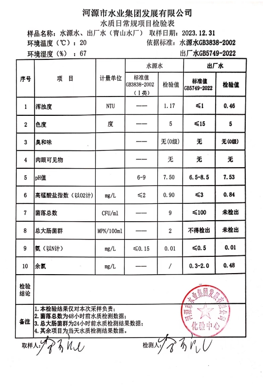 2023年12月31日水质检验报告