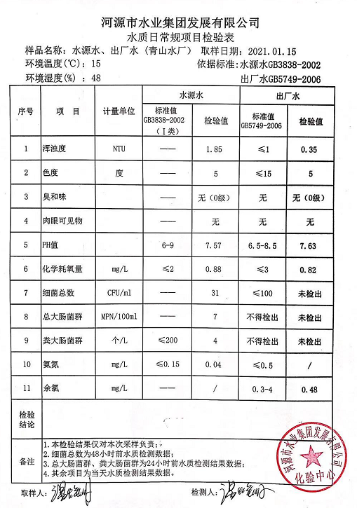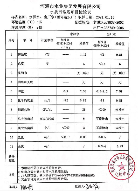 2021年1月15日水质检验报告